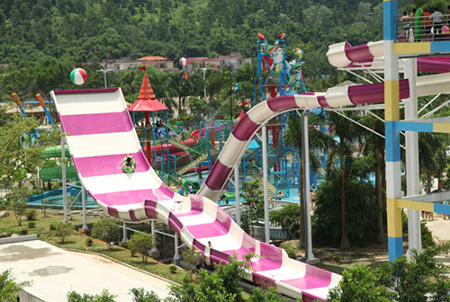 水上樂園設備:人沖天回旋水滑梯特別適合喜歡驚險、刺激的勇于挑戰的人群。 游客乘坐專用皮筏,從13米高平臺入口處下滑,經過一段螺旋引道后,如同太空飛船般俯沖而下,越過最低點后帶著巨大的慣性,沖向對面的爬坡滑板,并迅速爬升至最高點,體驗“沖天”的快感;驚魂甫定時,又在自身重力作用下快速回落,進入回收滑槽內,并再次經過半圓的回旋滑入落水池,體驗“回旋”的暈眩。